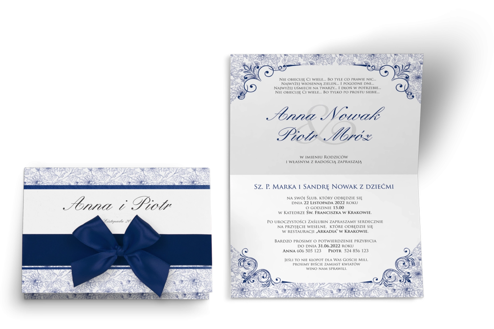 Zaproszenie ślubne Ornaments w motywie nr. 1 to elegancja propozycja stworzona w kolorach granatowych. Główna karta zaproszenia wykonana jest z wysokich jakości papierów o gramaturze od 246 gr do 300 gr. Sami możecie wybrać ich strukturę. Główną aplikacją jest wstążka satynowa przyklejona do zaproszenia w postaci paska, na którym spoczywa misternie i dokładnie zawiązana kokarda. Jako dodatki do tego wzoru możecie wybrać kopertę zwykłą lub kopety krzyżowe z piękną wklejką i kolorową personalizacją. Aby zaproszenie było jeszcze ciekawe polecamy dodać do niego dodatkowe wkładki.