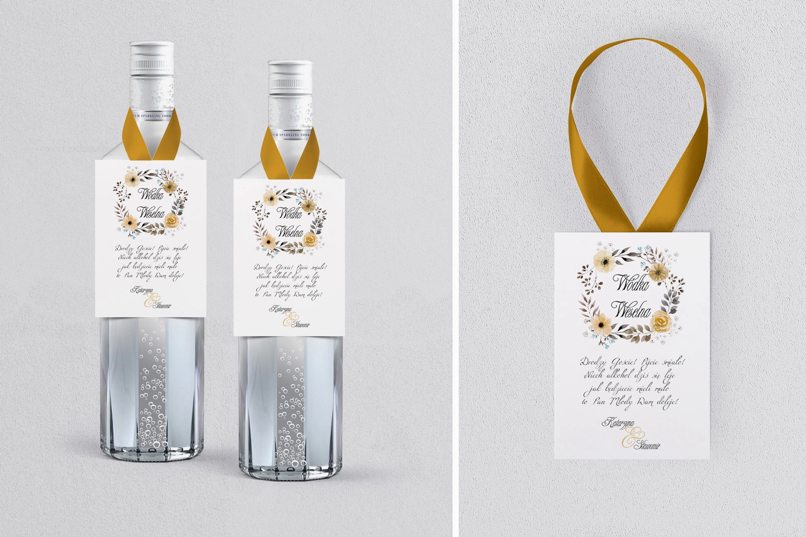 Tradycyjna zawieszka na wstążce do zawieszenia na butelce alkoholu, wódki lub wina. Doskonała do zaproszeń Akwarelowe Wianki. Zawieszki wykonywane są na grubych papierach fakturowanych lub gładkich oraz przy użyciu wstążek o podwyższonej sztywności.