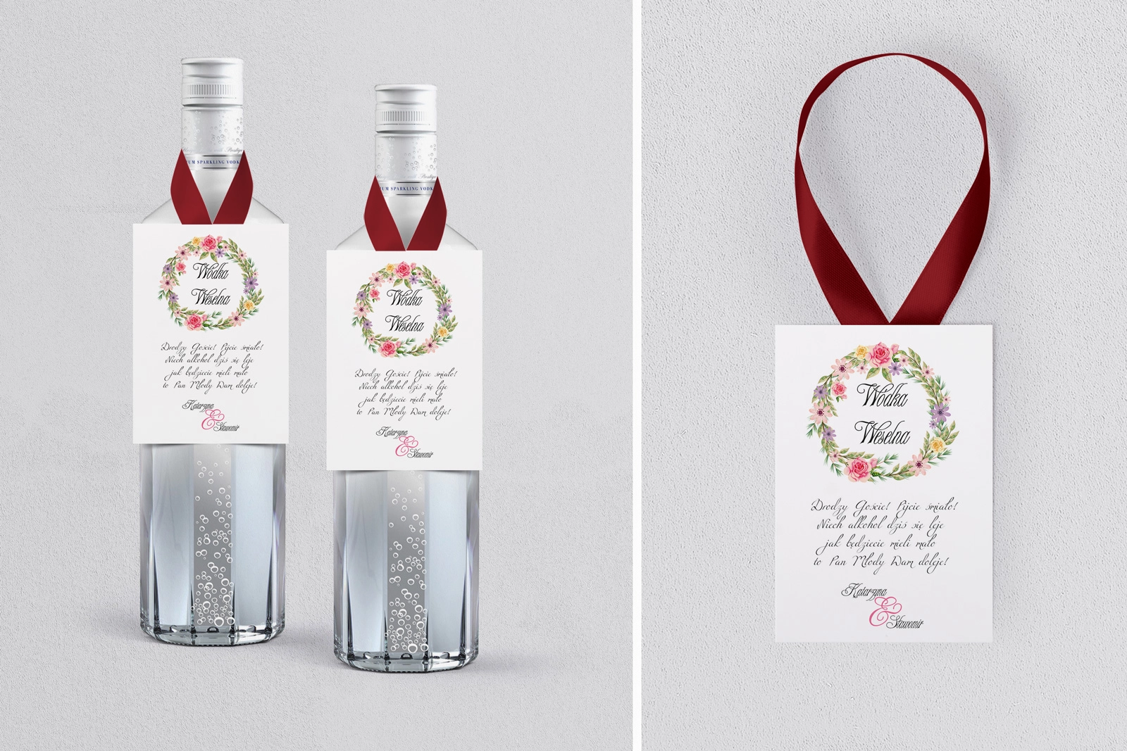 Tradycyjna zawieszka na wstążce do zawieszenia na butelce alkoholu, wódki lub wina. Doskonała do zaproszeń Akwarelowe Wianki. Zawieszki wykonywane są na grubych papierach fakturowanych lub gładkich oraz przy użyciu wstążek o podwyższonej sztywności.