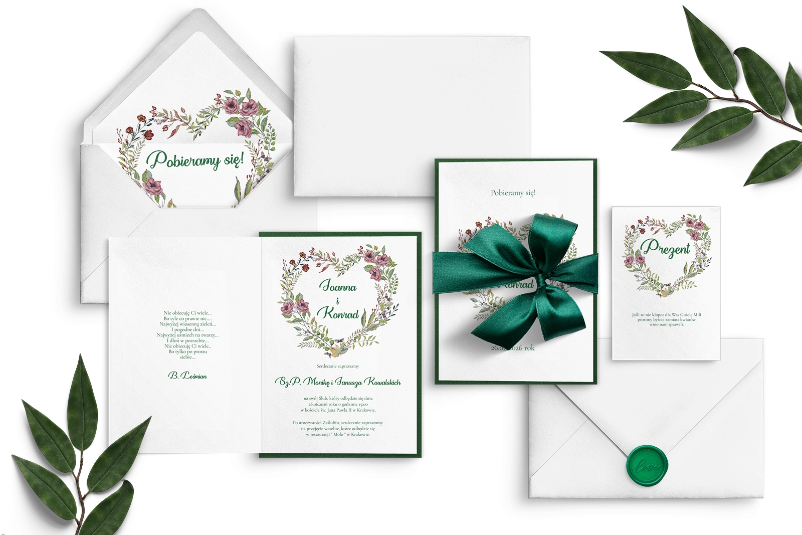 Zielone zaproszenie Heart of Flowers drukowane na papierze satynowym z piękną wstążką zieloną