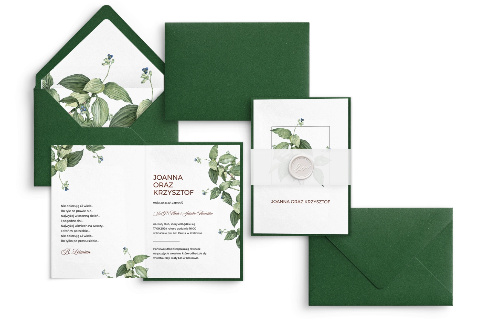 Zielone zaproszenie Meadow z kopertą zieloną i podklejką oraz opaską z kalki i lakiem białym