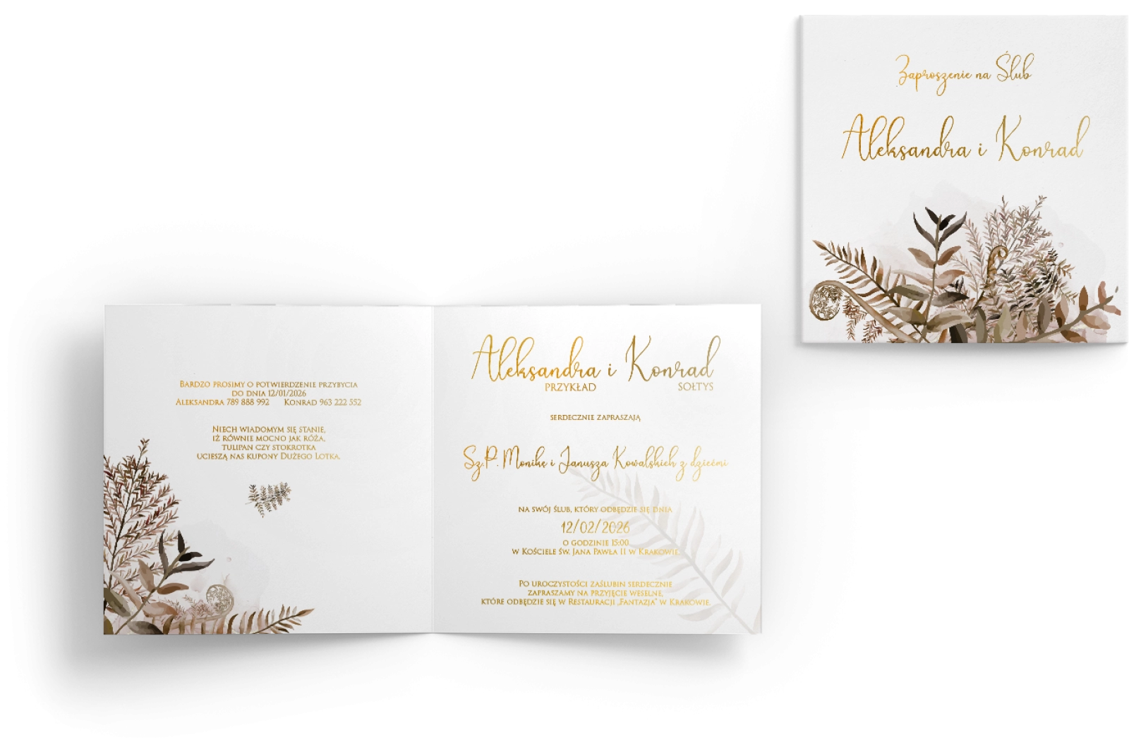 | Rozmiar zaproszenia z papierem ozdobnym | Złożone 147x147 mm (+- 2mm) |