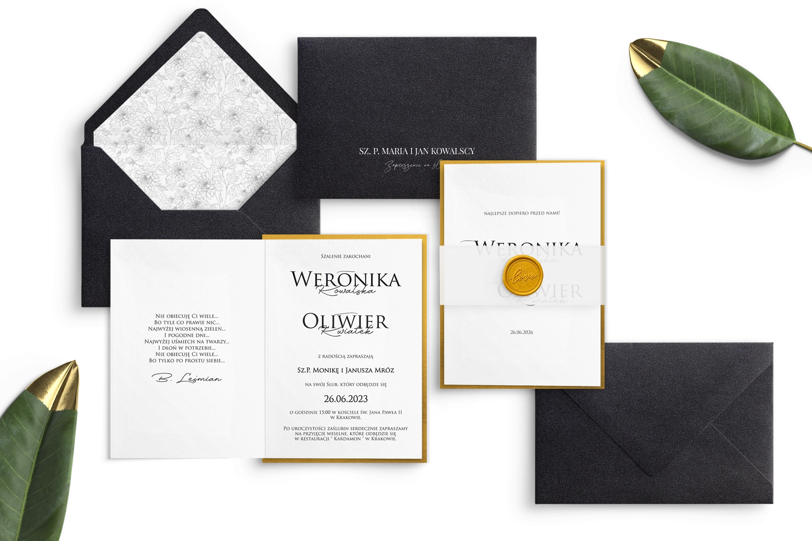 Złocone zaproszenia ślubne Minimalistyczne z czarną kopertą, złotą podklejką i lakiem