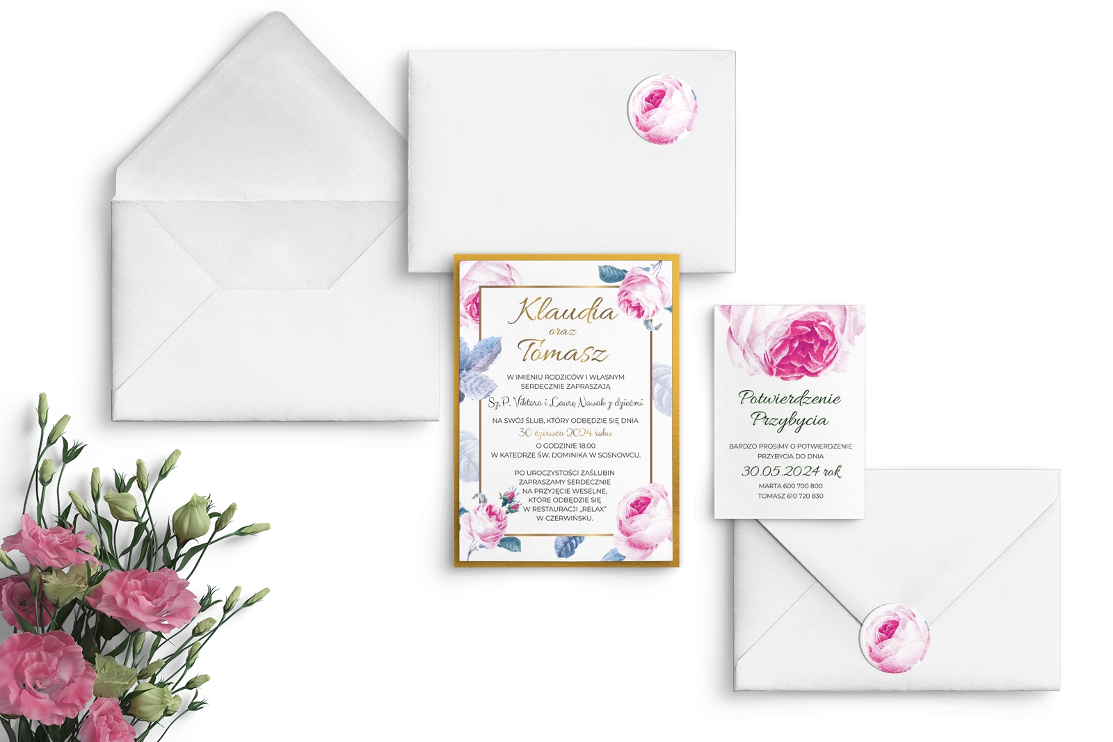 Złote Zaproszenia ślubne Dream z biała kopertą i zaklejką